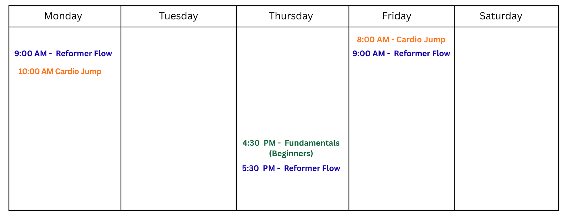 TENTATIVE REFORMER CLASS SCHEDULE TO BEGIN JANUARY 19TH